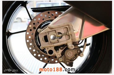 前制動采用直徑為320毫米的雙浮動式鉆孔盤配Brembo M430直栓式對向4活塞卡鉗,后制動采用直徑為220毫米的單制動盤配Brembo對向雙活塞卡鉗。配備了可關閉的Bosch 9MP ABS制動防抱死系統,帶有3種調節模式,并可抑制后輪離地。