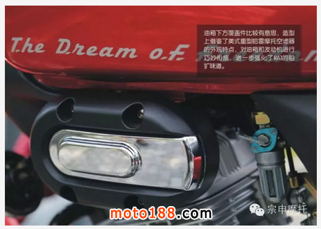 油箱下方覆蓋件比較有意思,造型上借鑒了美式重型哈雷摩托空濾器的外觀特點(diǎn),對油箱和發(fā)動(dòng)機(jī)進(jìn)行巧妙銜接,進(jìn)一步強(qiáng)化了RA1的粗獷味道。
