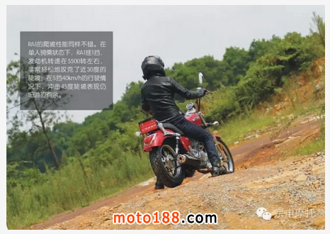 RA1的爬坡性能同樣不錯(cuò)。在單人騎乘狀態(tài)下,RA1掛1擋,發(fā)動(dòng)機(jī)轉(zhuǎn)速在5500轉(zhuǎn)左右,非常輕松地攻克了近30度的陡坡;在5擋40km/h的行駛情況下,沖擊45度陡坡表現(xiàn)仍舊游刃有余。