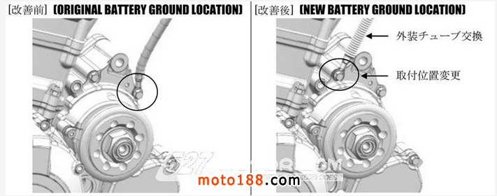 另外一個(gè)問(wèn)題是腐蝕物質(zhì)還會(huì)對(duì)電池電線與曲軸箱的連接產(chǎn)生影響,使電源發(fā)生故障,導(dǎo)致發(fā)動(dòng)機(jī)無(wú)法正常啟動(dòng)或關(guān)閉。為此鈴木將為連接線加裝保護(hù)膜,并更換電池電線與曲軸箱的連接位置,保證發(fā)動(dòng)機(jī)正常運(yùn)行。