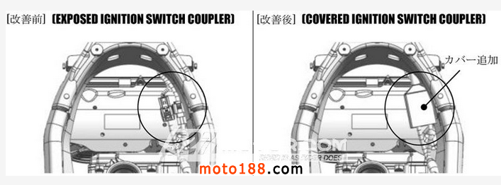 鈴木表示,2014-2015年V-Strom 1000的點(diǎn)火開關(guān)連接器終端遭到腐蝕性液體(很可能是咸水)腐蝕,這會(huì)導(dǎo)致點(diǎn)火鑰匙的“off”功能無(wú)法使用,出現(xiàn)不能關(guān)閉發(fā)動(dòng)機(jī)的現(xiàn)象。為解決這一問(wèn)題,鈴木將為點(diǎn)火連接器安裝護(hù)蓋,如果已經(jīng)出現(xiàn)腐蝕現(xiàn)象,經(jīng)銷商將為車主更換點(diǎn)火引線。