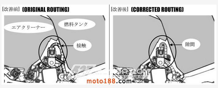 第三個(gè)問(wèn)題是2014-2016年車型的電線與油箱底部距離太近,摩托車正常行駛中的震動(dòng)會(huì)使電線的絕緣層磨損,導(dǎo)致電線與油箱接觸造成短路,并引發(fā)發(fā)動(dòng)機(jī)停滯。鈴木經(jīng)銷商將會(huì)對(duì)召回車型的電線進(jìn)行檢測(cè),如有必要將對(duì)線束重新安置,擴(kuò)大線束與油箱之間的空隙,如果裸線露出,鈴木將更換掉全部電線。