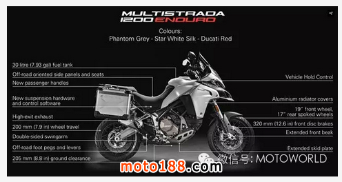 今天為大家深度解析的是2016年度杜卡迪推出的Multistrada最新款車型~ Multistrada 1200 Enduro,相信這也是與國際絕對同步的節(jié)奏了。Multistrada 1200 Enduro是一款具有超級性能的杜卡迪,它被賦予重任,預(yù)計在未來與寶馬、KTM等對手展開一場激烈異常的市場“爭奪戰(zhàn)“。
