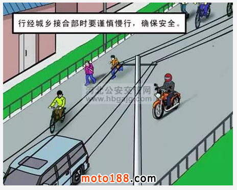 (2)行經城鄉(xiāng)接合部時,要考慮各種危險因素,行車中注意觀察路邊的行人、非機動車、農用車、大型貨車和路邊的攤位等,要有耐心、少鳴喇叭,并控制好車速;遇行人或者非機動車突然橫穿道路時,要及時減速或停車避讓。