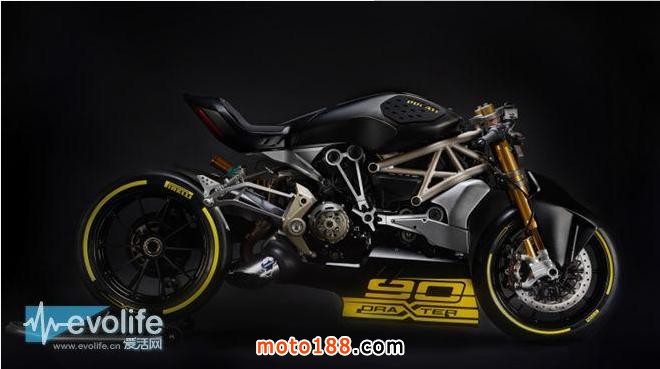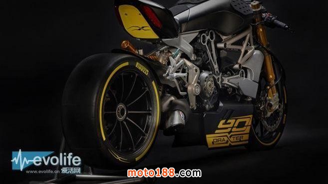 在Ducati DraXter側面印有90字樣,同時車尾攜帶了X標志。同時離合器也被換上了具有象征意義的干式離合器,沒有頭燈、儀表,完全是想讓人跳出枯燥的參數本身,用身體感受速度的味道。