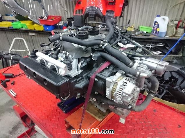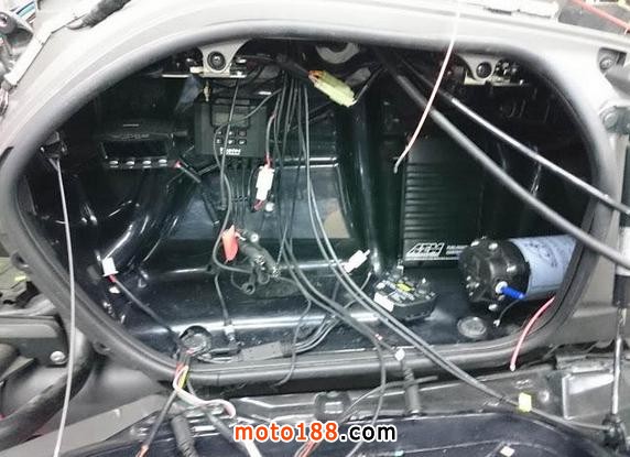 偽裝成防摔杠的進氣管。除了排氣與進氣外,渦輪增壓本身的水冷管路與機油管路也是另一項課題,雖然Gold Wing F6B 體積龐大,但盡量保持原廠的情況下,可利用空間也不多,不大可能再裝一個渦輪專用的冷卻水排。因為Gold Wing 的水冷排位在左右兩側(cè),因此在底下有一條連接兩個水冷排的泄水管,將這條管路廢除并連到渦輪水道,通過Gold Wing F6B 本身的冷卻水來冷卻。而這樣的改裝對后續(xù)保養(yǎng)來說,也只是從單一泄水螺絲來泄漏水箱水變成左右兩邊的水箱要分開泄水。渦輪的機油則是從發(fā)動機下方的油壓感知器位置,安裝一個三通管,拉出一條機油管路連接到渦輪內(nèi),而機油循環(huán)回發(fā)動機則是從機油注入孔導(dǎo)回。
