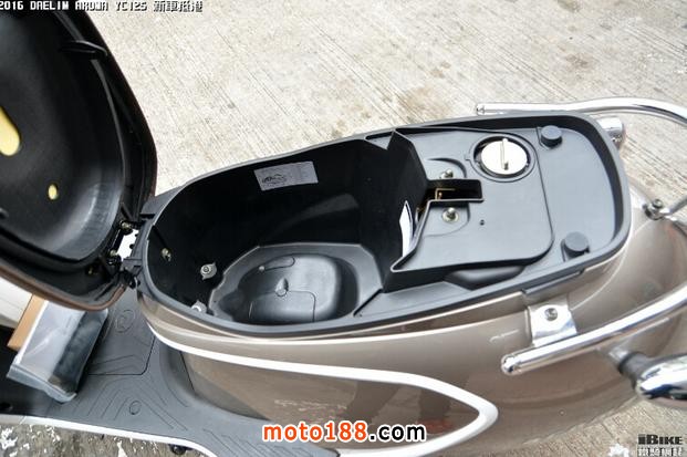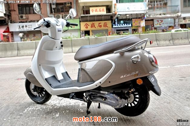 細看Aroma YC125:座下有單盔存放空間、有側(cè)架有泊車大架、有腳撻起動桿、前方有開放式柜桶仔、防滑式座墊、電鍍乘客扶手,真是麻雀雖小,五臟俱全。無論是女朋友或家人想買第一部車,Aroma YC125都是一個送禮的好選擇。