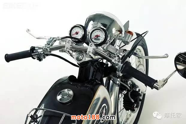 值得一提的是,和很多日系的改裝廠牌一樣,Motor Rock也喜歡Avons家的復(fù)古輪胎(例如該車裝配了前Speedmaster Mark II,后Safety Mileage Mark II兩條Avons輪胎),而不是像歐美廠牌那樣對Firestone Deluxes 情有獨(dú)鐘。