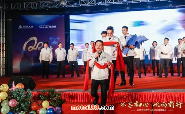 作為本次慶典唯一受邀的業內知名媒體《摩托車與配件》王建總經理不遠千里,遠道而來,慶賀利德工業成立20周年,向利德工業董事長贈送錦旗并發表賀詞。