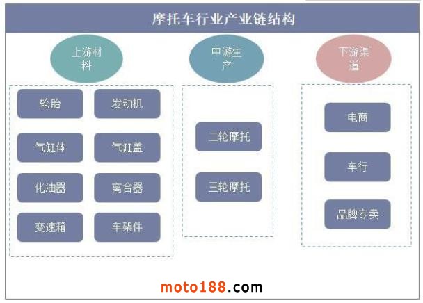 1885年,德國人巴特列布·戴姆勒發明了世界上最早的內燃機摩托車,1894年,德國的希爾德布朗-沃爾夫穆勒公司成為首個量產摩托車的廠家,并第一次將之稱為摩托;1896年,??松柟鹃_始生產摩托車;1898年奧林特-阿斯特公司開始生產摩托車……由此而始,摩托車開始進入全面量產時期。時至今日,現代摩托車已經發展得高度成熟,從車型方面,跑車、街車、巡航車、旅行車、探險車、越野車、踏板車,各種類型爭奇斗艷,從摩托車行業產業鏈來看,其上游主要是輪胎、發動機、離合器、變速器等原材料,下游銷售渠道主要是電商、車行、品牌專賣等。