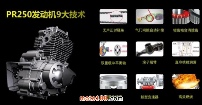 首先250R搭載的是宗申聯合比亞喬公司一起研發的250cc風油冷發動機,這款發動機之前也被用到了賽科龍的車型上,性能表現也足夠亮眼。在250R這款車上,發動機經過了升級調教,動力表現官方公告,0-100m僅需6.8S,官方給出的最高時速是115KM/H。最大扭矩18N.m/6000rpm。最大功率14Kw/8000rpm。