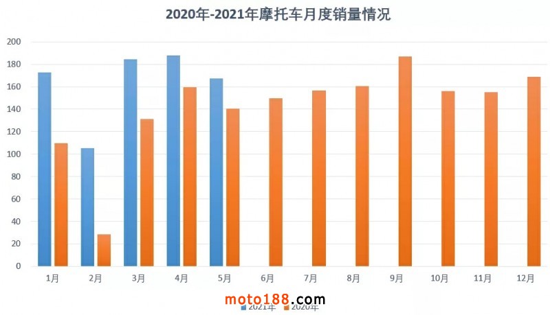 1-5月,全行業完成摩托車產銷824.92萬輛和825.67萬輛,同比增長37.23%和35.97%。其中,二輪摩托車產銷724.24萬輛和725.18萬輛,同比增長38.12%和36.82%;三輪摩托車產銷100.68萬輛和100.49萬輛,同比增長31.18%和30.14%。