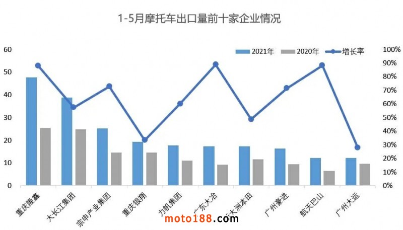 1-5月,摩托車出口量排名前十位的企業依次為:隆鑫、大長江、宗申、銀翔、力帆、大冶、新大洲本田、廣州豪進、航天巴山、大運,上述十家企業共出口224.16萬輛,占摩托車出口總量的61.45%。