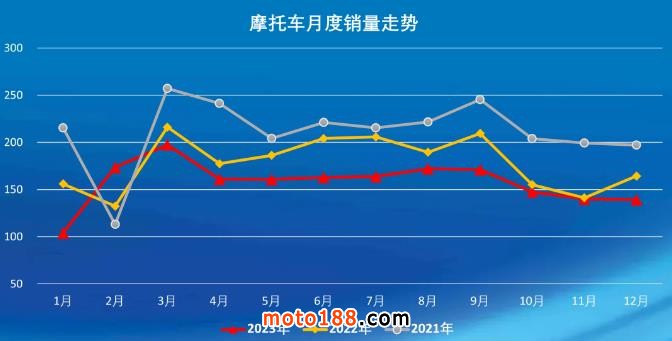 據中國摩托車商會統計,12月我國燃油摩托車銷量環比下降,同比增長。大排量休閑娛樂摩托車同比增長明顯,電動摩托車環比增長,同比下降。全年,燃油摩托車實現小幅增長,國內市場基本保持穩定,外貿出口明顯增長,產品結構優化,大排量休閑娛樂摩托車出口增長較為明顯。2023年摩托車行業整體保持了平穩向好的發展趨勢。