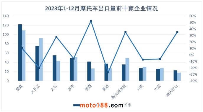 1-12月,摩托車出口量排名前十位的企業依次為:隆鑫、大長江、大冶、宗申、銀翔、豪進、新大洲本田、力帆、大運、航天巴山,上述十家企業共出口493萬輛,占摩托車出口總量的59.28%。