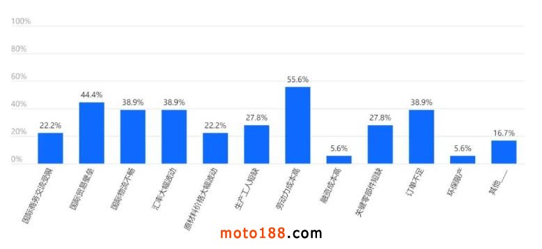 今年一季度,企業外貿業務遇到的問題主要集中在:勞動力成本高(55.6%)及國際貿易壁壘(44.4%)等方面。