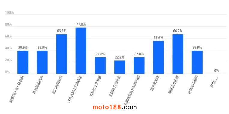 針對目前的生產經營狀況,企業希望政府出臺的主要措施有:保持人民幣匯率穩定(77.8%)以及出口信用保險(66.7%)和降低企業稅費(66.7%)等方面。
