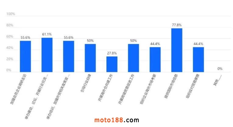 企業希望今后商會能重點開展的工作主要有:提供國際市場信息(77.8%)及舉辦展會、論壇,開展行業交流活動(61.1%)等。