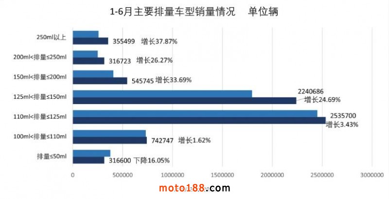 1-6月,全行業(yè)完成燃油摩托車產(chǎn)銷789.64萬輛和788.37萬輛,同比增長(zhǎng)11.29%和10.27%;電動(dòng)摩托車產(chǎn)銷159.51萬輛和163.28萬輛,同比下降47.01%和38.39%。1-6月,共產(chǎn)銷摩托車949.16萬輛和951.65萬輛,同比下降6.07%和2.89%。其中,二輪摩托車產(chǎn)銷832.6萬輛和834.49萬輛,同比下降7.08%和3.49%;大排量休閑娛樂摩托車(排量250cc以上,不含250cc)產(chǎn)銷35.27萬輛和35.55萬輛,同比增長(zhǎng)41.93%和37.84%。三輪摩托車產(chǎn)銷116.55萬輛和117.16萬輛,同比增長(zhǎng)1.79%和1.63%。