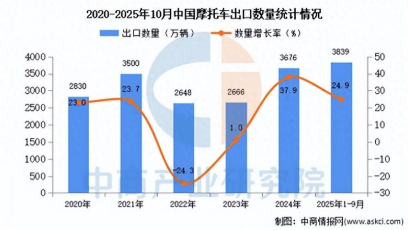 中商情報(bào)網(wǎng)訊:據(jù)中商產(chǎn)業(yè)研究院數(shù)據(jù)庫顯示,2024年中國摩托車出口量3676萬輛,同比增長37.9%。最新數(shù)據(jù)顯示,2025年1-10月中國摩托車出口量3839萬輛,同比增長24.9%。