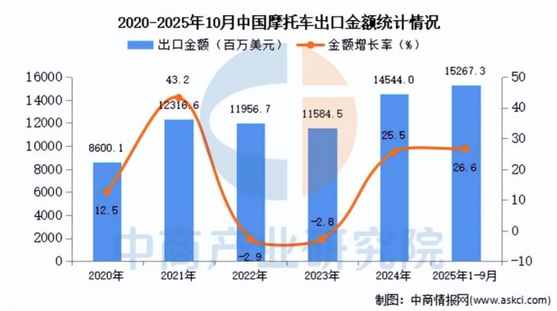 從金額方面來看,數(shù)據(jù)顯示,2025年1-10月中國摩托車出口金額15267.3百萬美元,同比增長26.6%。