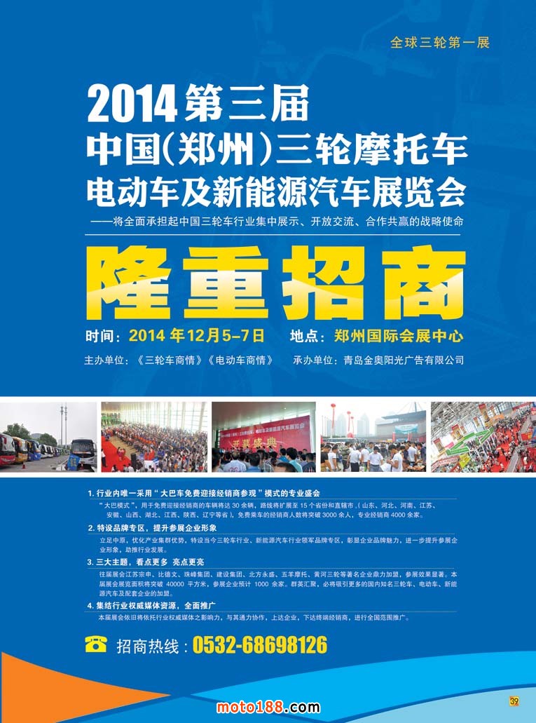 天氣在漸漸變冷,時令將進入冬季,對于南方市場來說,將迎來元旦、春節(jié)的節(jié)日市場,并達到新年銷售的高潮;對于北方市場來說,冬季則將步入淡季。對我們雜志社來說,冬季也將了收官階段,開始規(guī)劃新一年的工作,凡事預則立,不預則廢。為了明年更好的開展工作,我們雜志社規(guī)劃在2015年的工作分三條線開展:一是為了2015年的春季重慶全國摩托車及配件展示交易會的召開編寫新版的《西南(川渝)市場指南》,明年上半年的配件行業(yè)的工作重點放置在西南地區(qū);春季重慶全摩會也涉及新能源行業(yè),我們雜志也將為這一專題做好相應的工作。二是在2014年我們雜志社參與了很多的在電動車、三輪車行業(yè)的會議,頻率大概是每月參加4次會議,同時增加了重點市場的投放,但是工作進展卻不盡人意,在明年的工作中我們將會增加這一塊的投入,加大工作力度;同時把這個行業(yè)大數(shù)據(jù)進行整理匯總,初步統(tǒng)計有5~7萬家的資料需要核對,由于工作量巨大,此項工作目前已經(jīng)開始進行。三是我們今年新出刊的《新能源車》雜志,明年將以月刊的形式出刊,同時在全國有新能源汽車的市場做到全覆蓋,除了做到最好之外,把同行甩得更遠。