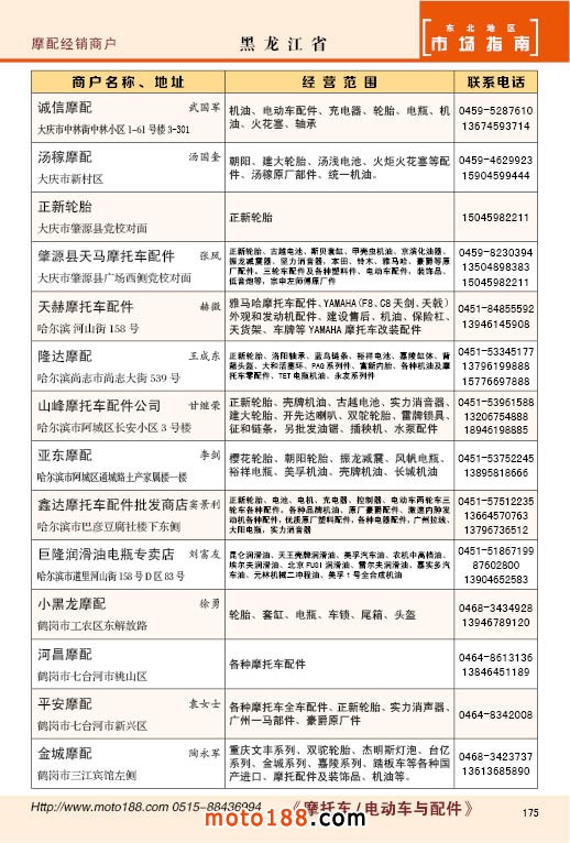 中國摩配市場從上世紀九十年代開始經過高速度的發展,正逐步減速,摩托車行業也漸呈式微,與之緊密相關的后市場的配件與維修也呈逐步下滑之勢,取代摩托車的在發達地區是汽車,欠發達地區是電動兩輪、電動三輪,甚至電動四輪車,隨著經濟的發展,出行的多樣化,也給了消費者多重的選擇。目前現有的摩托車及配件市場,也不再是以純摩托車為主體,有的市場電動車取代了摩托車,有的商店也是混合經營,這些變化在《市場指南》里面都有所反應。這次《北方指南》一些小市場不再單列,并入到相應的省份中去;以前去市場的公交線路,書中也不再列入,因為現在的地圖導航功能十分強大,既新又準。