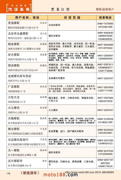 中國摩配市場從上世紀九十年代開始經過高速度的發展,正逐步減速,摩托車行業也漸呈式微,與之緊密相關的后市場的配件與維修也呈逐步下滑之勢,取代摩托車的在發達地區是汽車,欠發達地區是電動兩輪、電動三輪,甚至電動四輪車,隨著經濟的發展,出行的多樣化,也給了消費者多重的選擇。目前現有的摩托車及配件市場,也不再是以純摩托車為主體,有的市場電動車取代了摩托車,有的商店也是混合經營,這些變化在《市場指南》里面都有所反應。這次《北方指南》一些小市場不再單列,并入到相應的省份中去;以前去市場的公交線路,書中也不再列入,因為現在的地圖導航功能十分強大,既新又準。