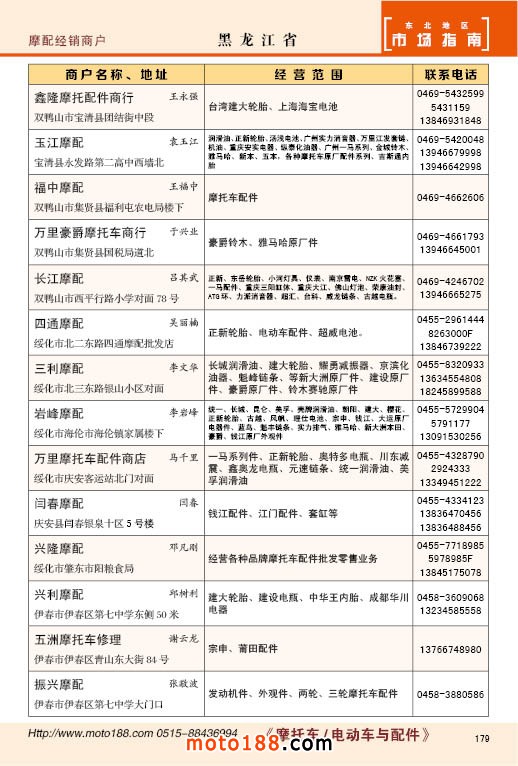 中國摩配市場從上世紀九十年代開始經過高速度的發展,正逐步減速,摩托車行業也漸呈式微,與之緊密相關的后市場的配件與維修也呈逐步下滑之勢,取代摩托車的在發達地區是汽車,欠發達地區是電動兩輪、電動三輪,甚至電動四輪車,隨著經濟的發展,出行的多樣化,也給了消費者多重的選擇。目前現有的摩托車及配件市場,也不再是以純摩托車為主體,有的市場電動車取代了摩托車,有的商店也是混合經營,這些變化在《市場指南》里面都有所反應。這次《北方指南》一些小市場不再單列,并入到相應的省份中去;以前去市場的公交線路,書中也不再列入,因為現在的地圖導航功能十分強大,既新又準。