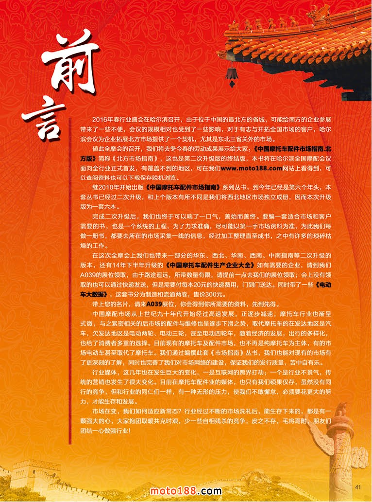 値此全摩會的召開,我們將去冬今春的勞動成果展示給大家:《中國摩托車配件市場指南.北方版》簡稱《北方市場指南》,這也是第二次升級版的終結版,本書將在哈爾濱全國摩配會議面向全行業正式首發,有覆蓋不到的地區,可在我們www.wfenlaw.cn網站上看得到,可以查閱資料也可以下載保存脫機瀏覽。