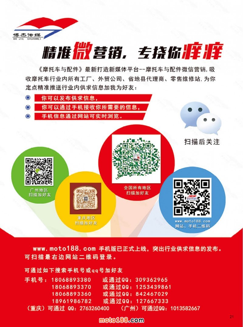人勤春早,元宵節過后我們就整裝待發,實施了走訪全國市場的計劃,這次走訪帶著幾個任務:一、了解中國國內摩托車市場的具體發展情況,并將這些見聞在我們雜志和網站上與行業企業分享,讓大家對目前市場有一個感性的認識。二、我們帶著近年編的《市場指南》對著市場每一個客戶進行核對,哪些已經改行了,哪些是新開的,具體數量有什么變化,新增了什么項目?我們帶著手機將門面拍下,這樣信息就更詳細和直觀。三、我們對新的《摩托車微信營銷平臺》進行了現場推廣,掃描客戶的微信、添加好友。因為舉全公司之力,用團隊去作戰,我們每天新增好友近200個,我們在這個行業,要么不做,要做就做最好。在目前好友還沒達到我們預期的數量時,我們只作無償的服務,修煉內功,待成熟后再大力的推廣。我們保持足夠的定力,志在長遠穩步的開展工作。互聯網作為目前的通訊工具,我們盡可能將它的功能利用發揮起來,以更好的多形式的服務行業,沒有去市場第一線辛勤的開展工作,靠坐在電腦前優化,再用普遍人聽不懂的新詞忽悠,制造一些云天霧地的概念,然后就自夸這是互聯網思維,實際是對互聯網的褻瀆,建的是空中樓閣,在實際操作中往往會有一種處處碰壁,事事難成的玻璃墻擋著。