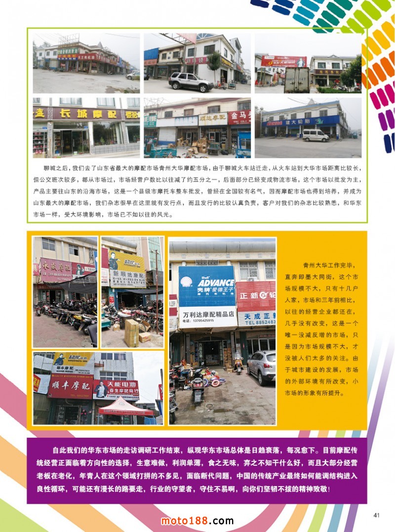 今年我們還做了一件大事:鑒于國內(nèi)摩配市場經(jīng)過長期調(diào)整后,也相對集中,便于我們對全國市場進行直投發(fā)行,我們對傳統(tǒng)的發(fā)行網(wǎng)絡(luò)進行了大調(diào)整,對部分小型市場從事批發(fā)的企業(yè)實行直投,對非市場各地區(qū)的二、三級批發(fā)商也納入到直投范圍,這部分企業(yè)資料我們已經(jīng)整理完畢,部分省區(qū)已經(jīng)開始直投,以前客戶擔(dān)心發(fā)行不到位的顧慮現(xiàn)在可以打消了,另外我們的微信和網(wǎng)站對我們的發(fā)行起到了很大幫助,通訊的改善,使我們的雜志通過不同的形式,讓行業(yè)所有的人士都能看到,對我們來說:市場依然在給我們發(fā)展的機會,我們自然不會放棄,努力做得更好,飛得更高!