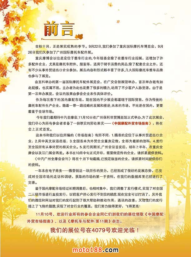 我們盡心為所有參會(huì)者準(zhǔn)備了一份厚實(shí)的勞動(dòng)果實(shí)——《中國(guó)摩配外貿(mào)市場(chǎng)指南》,將在