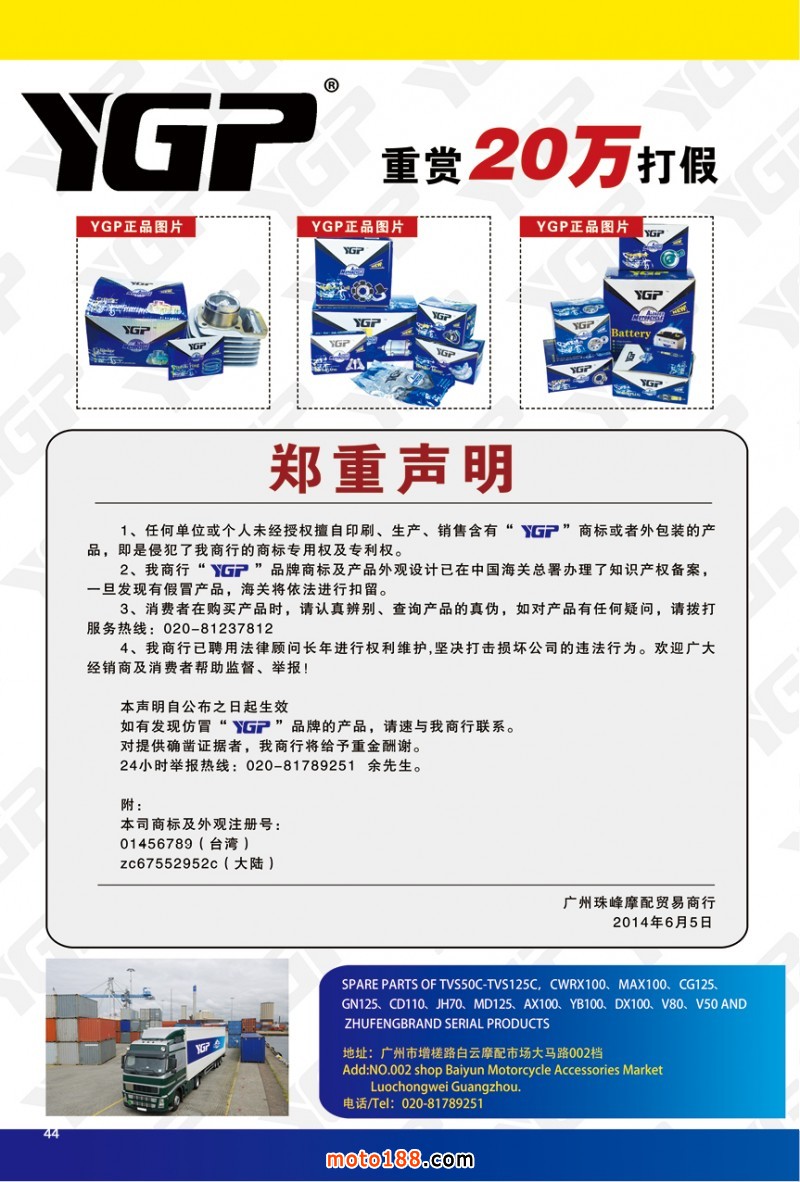最新升級的《摩配華南市場指南》升級版在第76屆廣州全國摩托車及配件展示交易會上首發,歡迎朋友們來3109號展位。接著將在廣州、重慶摩配市場全面派送,在廣州福星、松南市場門口、及白云三個檔口常年設立發行窗口;發行至廣州、重慶、江浙的幾大板塊主要廠家及全國的主要摩配市場。
