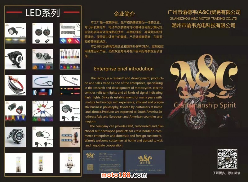本工廠是一家集研發,生產和銷售貿易為一體的企業,專門研發摩托車、電動車改裝轉向燈和各種信號指示爆閃燈。自創辦多年來憑借成熟的技術,豐富的經驗,高效務實的經營理念,深受海內外客戶的青睞。產品遠銷南美洲,東南亞