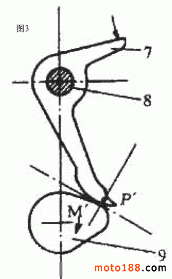 4. 為什么柱銷稍有松動,便會產生較大的敲擊聲呢?這要從整個配氣機構來分析;如圖 1-24 所示,氣門彈簧產生的彈力,通過上搖臂、氣門推桿、下搖臂作用于凸輪上的 M 點,力的方向如圖2 中 P 的方向,使凸輪產生逆時針轉動的趨向;當凸輪隨齒輪轉過一個角度后,作用力點移至 M ‘,方向變為 P ‘的方向,使凸輪產生順時針轉動的趨向,如圖 1-25 所示;正是由于這個力的方向周期性地改變,使圓柱銷子與銷孔兩側碰擊而發出聲響。