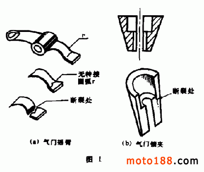 5. 氣門搖臂和氣門鎖夾斷裂引起的響聲如圖1所示,氣門搖臂頭部強度不夠或轉接處未銑出圓弧“ r ”,致使應力集中而導致斷裂;氣門鎖夾的材料有缺陷或有淬火裂紋引起鎖夾碎裂。這種斷裂和碎裂現象都會產生突然的響聲。