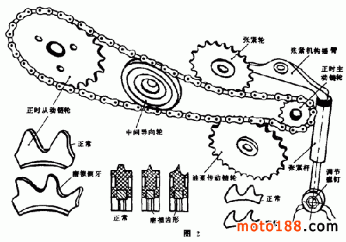 ( 3 )配氣機構傳動系統(見圖 2 所示)若有故障,如鏈條的張緊機構失靈,正時主動鏈輪、正時從動鏈輪、中間導向輪等安裝時不在同一平面上,會使發動機發出金屬摩擦聲、刮削聲或震耳的噪聲,有時還會引起強烈的震動。如不及時處理,不但會使上述零件損壞報廢,還會磨下許多橡膠末和金屬屑,堵住潤滑油路,惡化潤滑條件,使發動機進一步損壞。