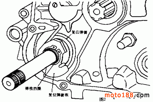 ( 6 )拆下啟動軸上的彈性擋圈、復位彈簧座及復位彈簧(見圖 2),再擰下左、右曲軸箱體所有連接螺栓,將左、右曲軸箱體分開。