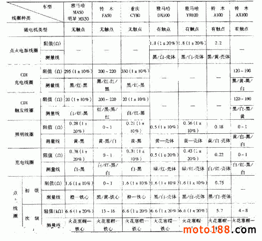 磁電機(jī)故障,有時(shí)可通過(guò)測(cè)量磁電機(jī)內(nèi)各線圈電阻值的方法來(lái)判定。下表中所列數(shù)據(jù)是線圈的正常阻值,測(cè)量時(shí)若線圈的阻值過(guò)小,說(shuō)明線圈內(nèi)部有短路之處;若線圈阻值為無(wú)窮大,說(shuō)明線圈內(nèi)部斷路。