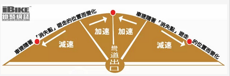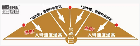 如果入彎前的車速是在駕駛者所能應付的能力之內(nèi)的話,「消失點」會和駕駛者穩(wěn)定地保持著一定的距離,大部份情況都會是兩、三個車位的距離。但若果駕駛者的轉(zhuǎn) 向能力未能及時消化彎道的變化時,「消失點」便會急速地向駕駛?cè)说姆较蚩拷砣霃澦俣冗^高,超出騎士本人的轉(zhuǎn)向能力,減速是唯一辨法,否則人車恐怕會 沖出彎道之外.....