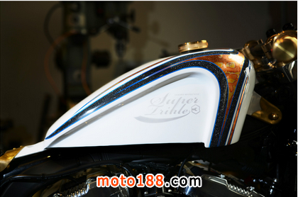油箱選用了哈雷經典的飛機頭油箱。這樣一搭配有人會說這不就是輛X48嗎?確實很相似,但我們要讓它從細節上區分開來。首先是復古的黃銅點綴件絕不能少,更多選擇了格柵式設計的套件。然后是簡化車把上的開關組。哈雷的開關組拆除后,自然離合器和剎車上泵也就沒辦法再用,因為和開關組是拼接的,拆掉開關剩下很難看的拼接口,果斷換掉。