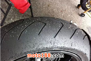 在實際騎行中,極限牽引力的計算并不像上面那樣簡單。在輪胎抓地的過程中,它同時也會“脫掉”一部分物質。它“脫掉”的東西是不同的化學物質,包括:油,蠟,和橡膠混合在一起的各種顏料。輪胎和地面的摩擦和由此產生的熱量會把這些成分磨掉。你是否注意到,在高速過彎之后,輪胎上會有一圈紫色的環。這個環叫做“榮暈”。“榮暈”是輪胎內部的化學物質因為熱量被祛除出輪胎而產生的。
