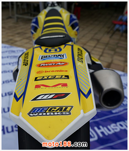 今次的改裝,除了令引擎有更佳輸出的FMF鈦合金排氣喉外,大多集中在更佳的控制、輕 量化、強化保護及美觀的部件。如配上大量HUSQVARNA同廠的Husky Power強化與美觀的改裝部件、SCOTTS中置釘把、TU Bliss可低氣壓防脫的內胎、更佳起動更輕量的Antigravity鋰電池及Bridgestone X30R Battlecross MX motocross 輪胎。當然,最吸眼的莫過於車身度身訂造黃色自定圖案的車身貼紙。